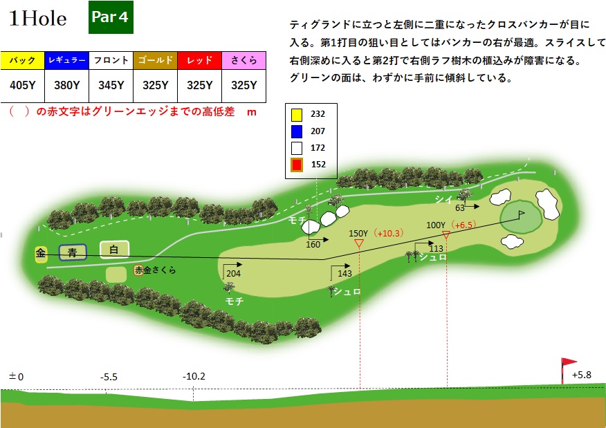ただし、左OBを警戒。第2打は左右のガードバンカーに注意。