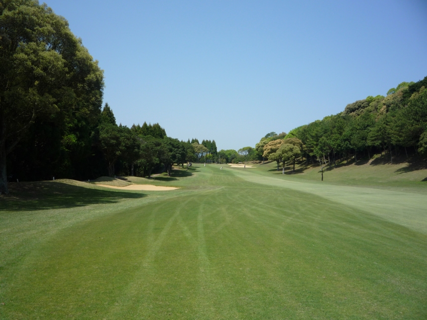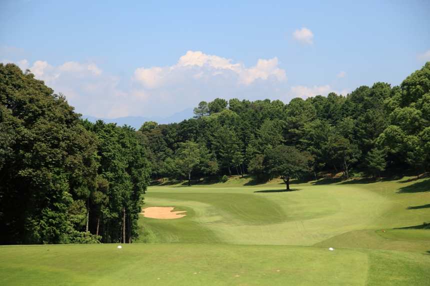 左にドッグレッグし、第1打は打ち上げ、第2打はゆるやかな打ちおろしのミドルホール。