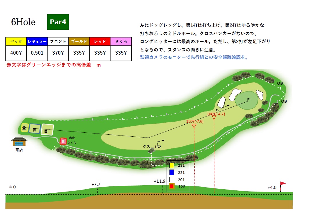 ただし、左OBを警戒。第2打は左右のガードバンカーに注意。